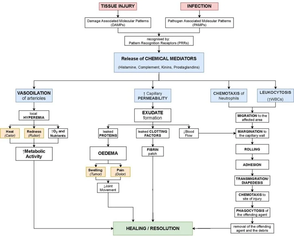 급성 염증은 양날의 검같은 성질을 갖고 있습니다. 원래 목적은 감염/손상 부위에 가서 감염을 치유하거나 조직의 재생을 증진하는건데요, 염증반응이 과하거나 잘 조절되지 못하면 오히려 조직 손상, 괴사 , 여러 질병을 유발할 수 있습니다.