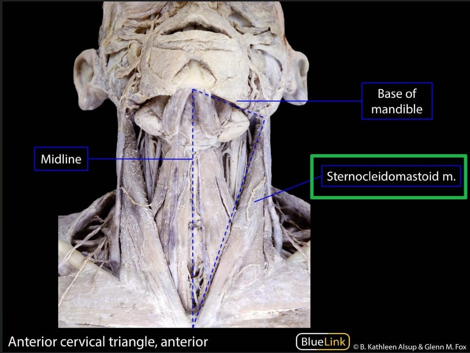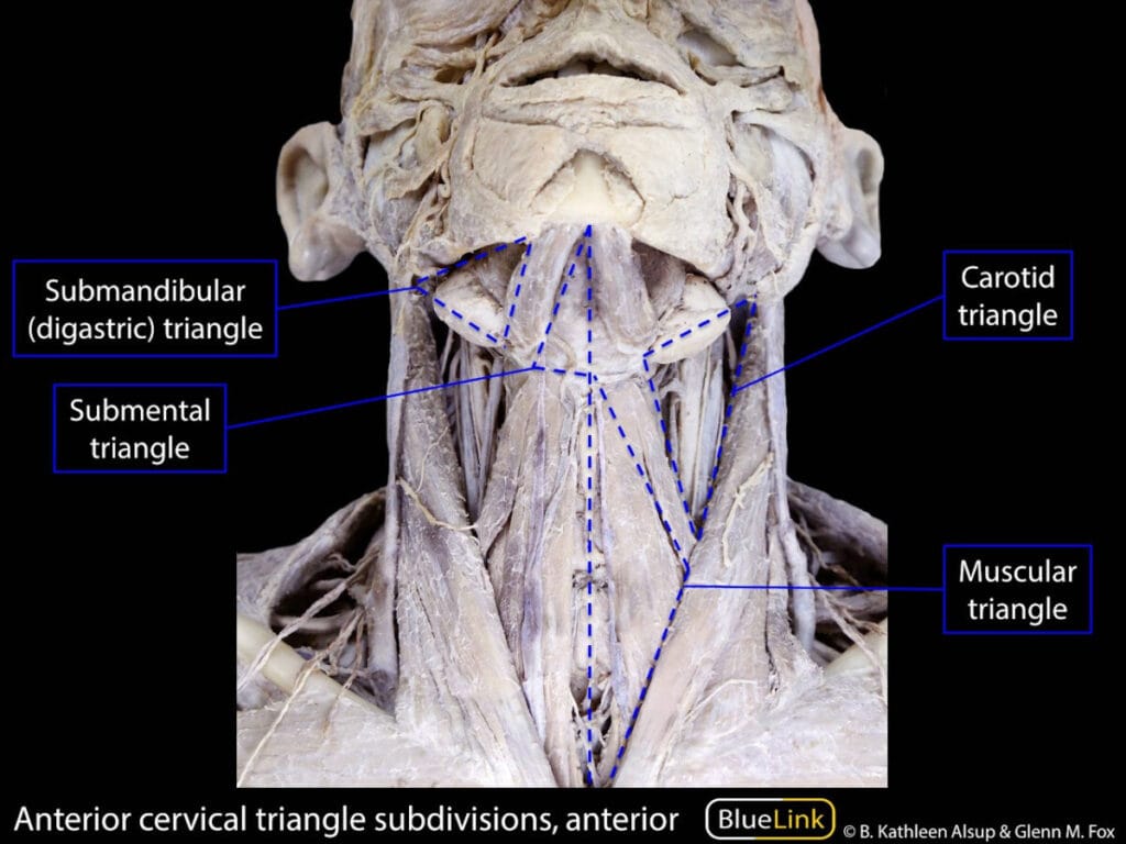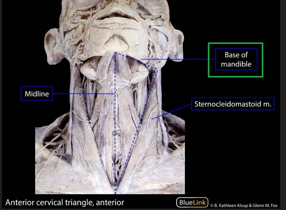 | ✅ 흉쇄유돌근, 턱뼈, 정중선으로 둘러싸인 삼각형 영역입니다. |