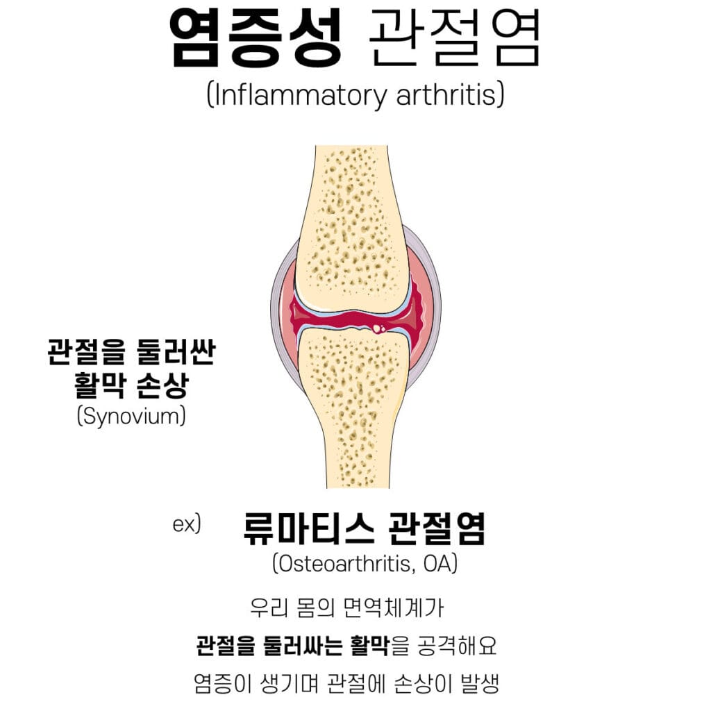각 질환군의 대표 주자인 골관절염과 류마티스 관절염을 중심으로 비교했습니다. 이해에 도움되셨길 바랍니다 🙂