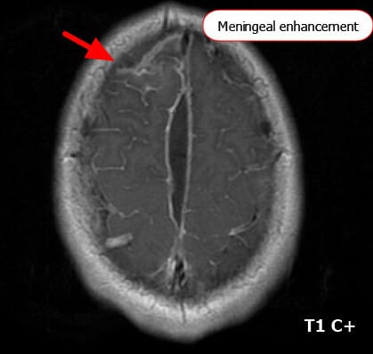 가장 흔한 소견입니다. 특히 조영증강 MRI(T1 + gadolinium)에서 뇌 표면을 따라 선명한 조영증강이 보입니다.