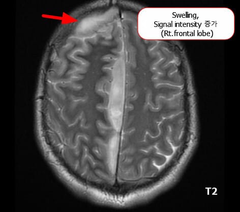 염증 반응으로 뇌 조직에 부종이 발생할 수 있습니다. 특히 확산강조영상(DWI)이나 T2/FLAIR에서 고강도(high signal intensity)로 나타납니다.