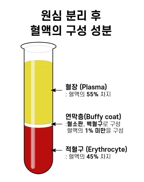 혈액을 원심분리기에 돌리면 무거운 성분은 아래로, 가벼운 성분은 위로 이동하며, 세 가지 층으로 나뉩니다: