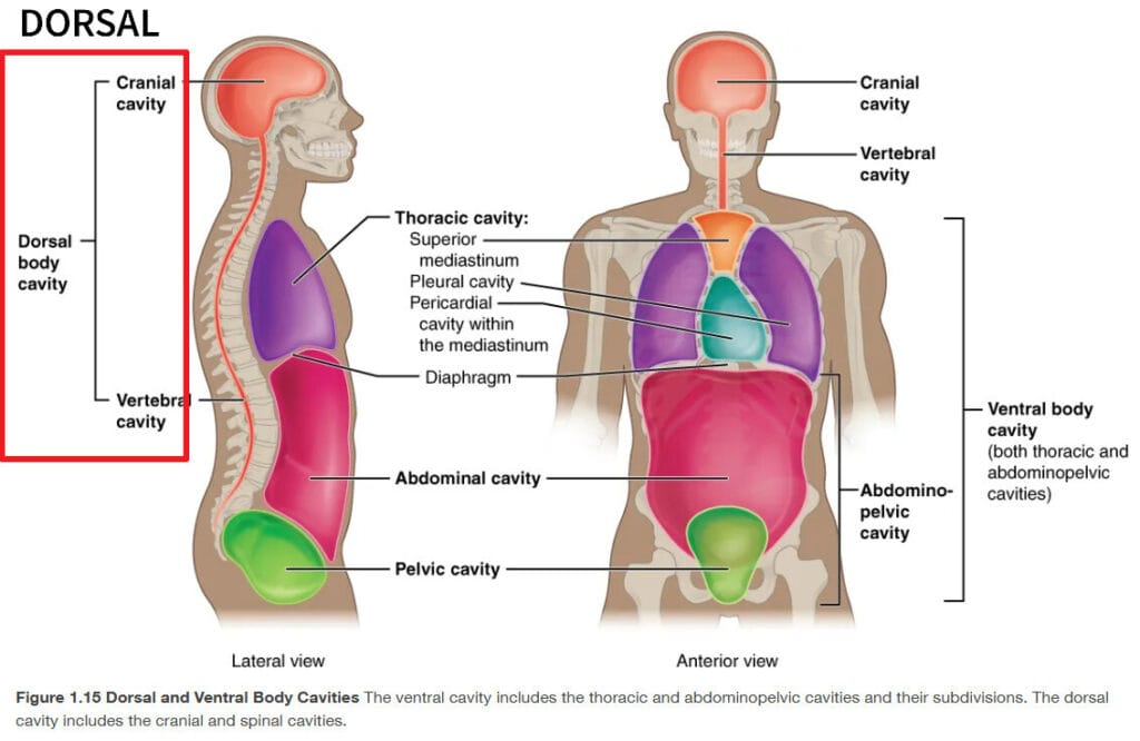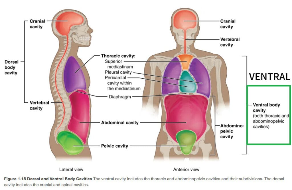 신체의 주요 체강들은 크게 두 가지로 나눌 수 있습니다. 배측 체강(등쪽, Dorsal Cavity)과 복측 체강(배쪽, Ventral Cavity)입니다. 배측은 등쪽, 몸의 뒤쪽에 위치한다는 말이고, 복측은 배쪽, 앞쪽에 위치한다는 뜻입니다.
