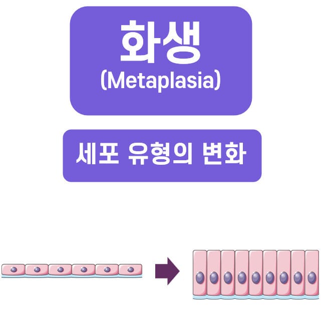 화생(Metaplasia)은 세포 유형이 다른 유형으로 변하는 과정을 말합니다. 주로 장기간의 자극이나 세포 스트레스로 인해 발생하며, 이는 세포가 생존을 위해 새로운 형태로 적응하는 일종의 방어 기전입니다. 대표적인 예로 바렛 식도(Barrett’s Esophagus)를 들 수 있는데요, 위산 역류로 인해 식도의 상피세포가 원래의 편평 상피에서 원주 상피로 변형되는 현상입니다. (=바렛 식도는 쉽게 말해 위산에 적응하기 위해 식도 끝 부분의 점막이 위 조직처럼 변했다고 생각하면 돼요)