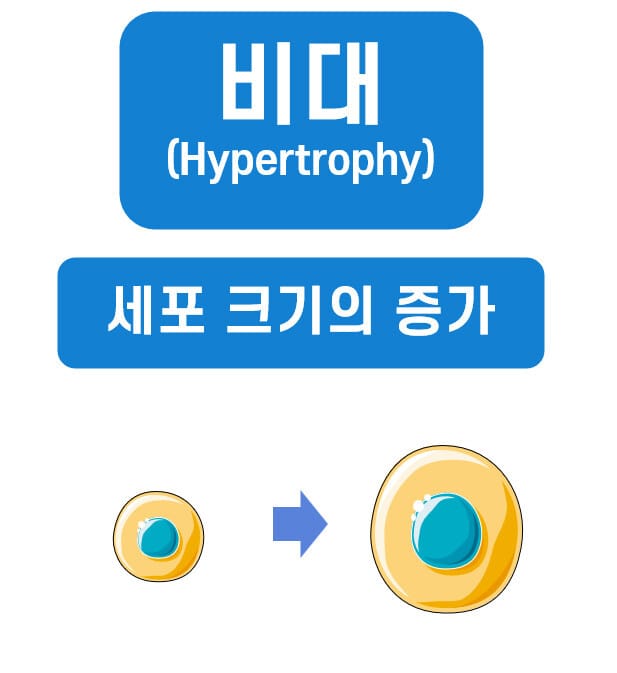 세포 적응 중 비대(Hypertrophy)는 특정 조직이나 기관의 개별 세포 크기가 증가하여 전체 조직의 크기가 커지는 현상을 의미합니다. 위에서 설명한 과형성(Hyperplasia)과 달리, 비대는 세포 수의 변화 없이 세포 자체의 크기 증가에 초점을 맞춥니다.