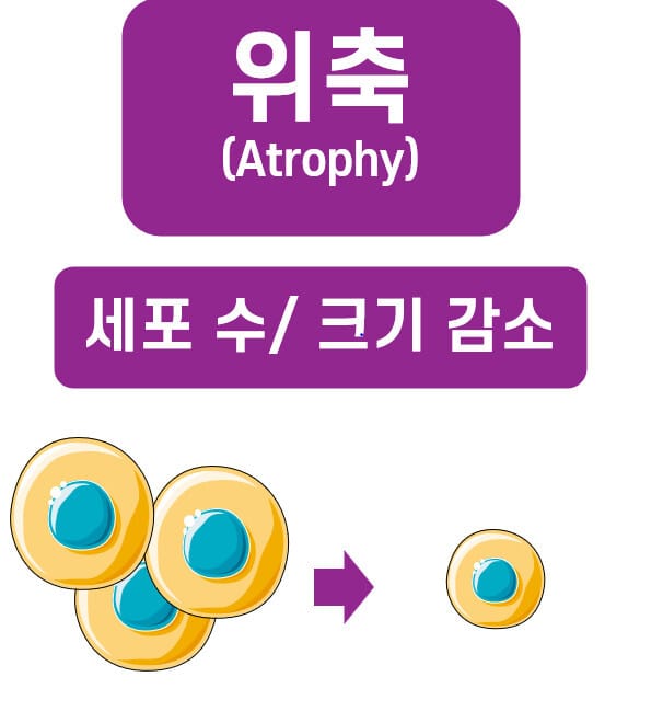 위축(Atrophy)은 조직이나 기관의 크기가 감소하는 현상을 의미합니다. 이는 세포 수의 감소(세포 사멸) 또는 세포 크기의 감소에 의해 발생할 수 있습니다. 위축은 주로 비활동 영양 결핍, 노화, 질병 등 다양한 원인에 의해 유발됩니다. 장기간 운동을 쉬게 되면 근육량이 감소하는 것도 대표적인 예시로 있어요