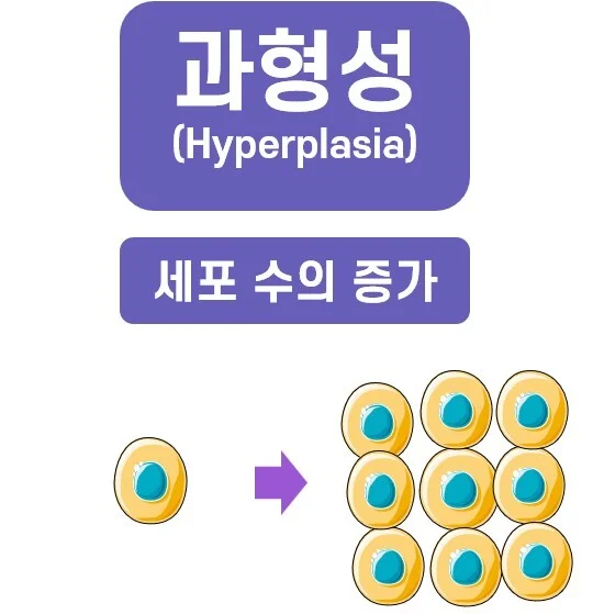 과형성(Hyperplasia)은 특정 조직에서 세포 수가 증가하는 현상을 의미합니다. 생리적(정상적인) 자극이나 병리적(비정상적인) 자극에 의해 발생할 수 있습니다. 예를 들어, 임신 중 자궁이 커지는 것은 생리적 과형성에 해당하며, 이는 정상적인 신체 반응입니다. 반면, 병리적 과형성은 암으로 발전할 수 있는 위험을 내포하고 있으며, 양성 전립선 비대증(BPH)은 그 예외로, 암으로 발전하지 않지만 전립선의 크기가 커지는 상태입니다.