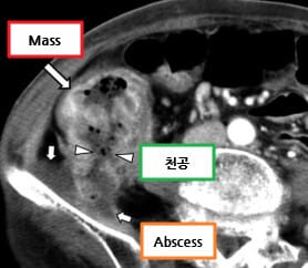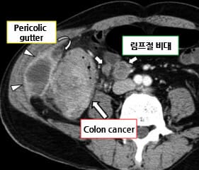 장 주변 지방조직에 염증 또는 종양 침윤이 퍼지며 음영이 흐려지는 소견입니다.