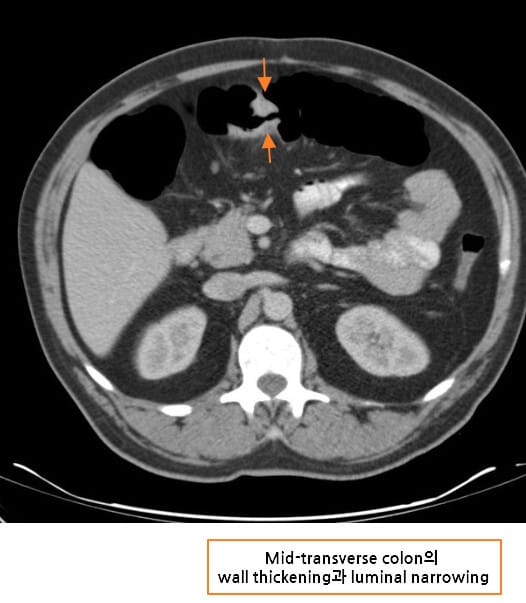 중앙이 좁아진 고리 형태의 협착으로, 전형적인 결장암 소견입니다.