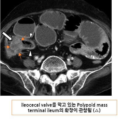 맹장, 상행결장에 발생하며 대변이 묽고 장강이 넓어 폐색 증상은 적고, 전신증상이 두드러집니다.