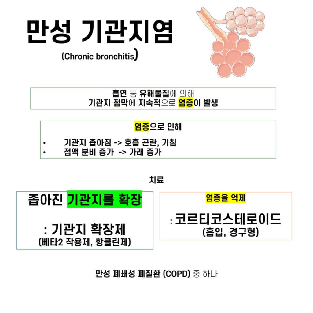 | ✅ 기관지 확장제: 기도 주변 근육을 이완시켜 숨쉬기를 더 쉽게 만듭니다. ✅ 흡입 코르티코스테로이드: 기도 염증을 줄이고 악화를 예방하는 데 도움이 됩니다. |