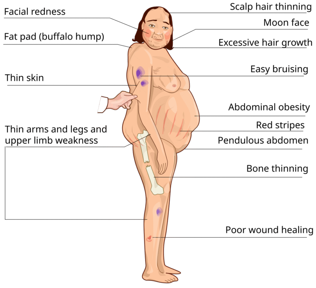 | 코르티솔의 대사 작용으로 인한 전신 합병증입니다. |