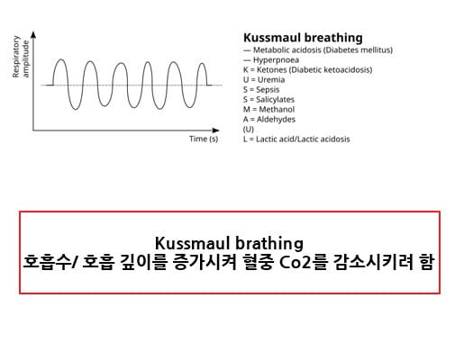 | 대사성 산증 보상 반응으로 깊고 빠른 호흡이 나타납니다. |