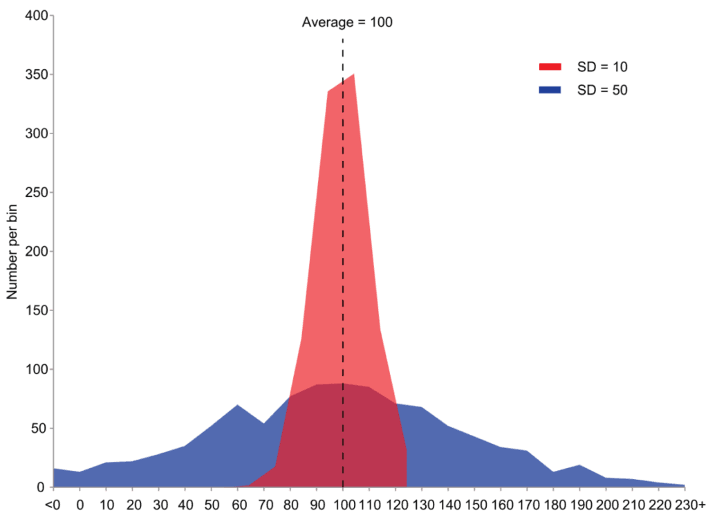 Two samples with the same mean and different standard deviations. By JRBrown – 자작, Public Domain, https://commons.wikimedia.org/w/index.php?curid=10777712
