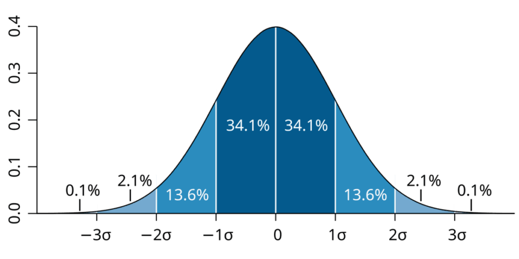 Normal Distriburtion curve that Illustrates Standard Deviations . By M. W. Toews – 자작, based (in concept) on figure by Jeremy Kemp, on 2005-02-09, CC BY 2.5, https://commons.wikimedia.org/w/index.php?curid=1903871