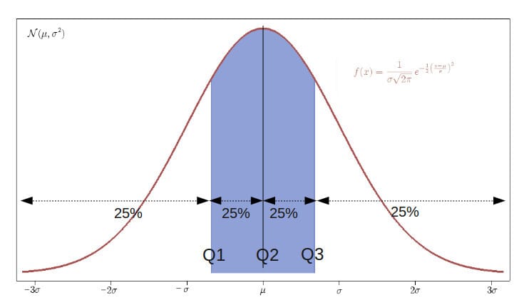 Normal distribution. Shows the quartile and interquartile range of a normal distribution. By Iqr.png: Ark0nderivative work: Gato ocioso (talk) – Iqr.png, CC BY-SA 3.0, https://commons.wikimedia.org/w/index.php?curid=14702157