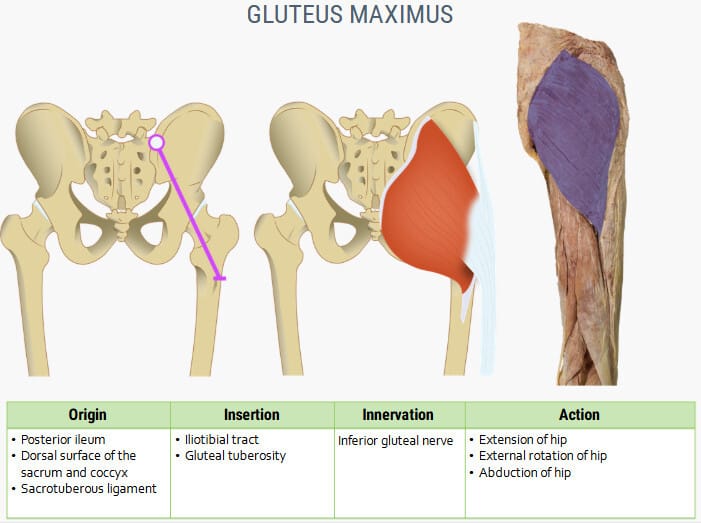 ✅ 대둔근의 상부 섬유는 외회전, 신전뿐 아니라 외전에도 부분적으로 관여합니다.