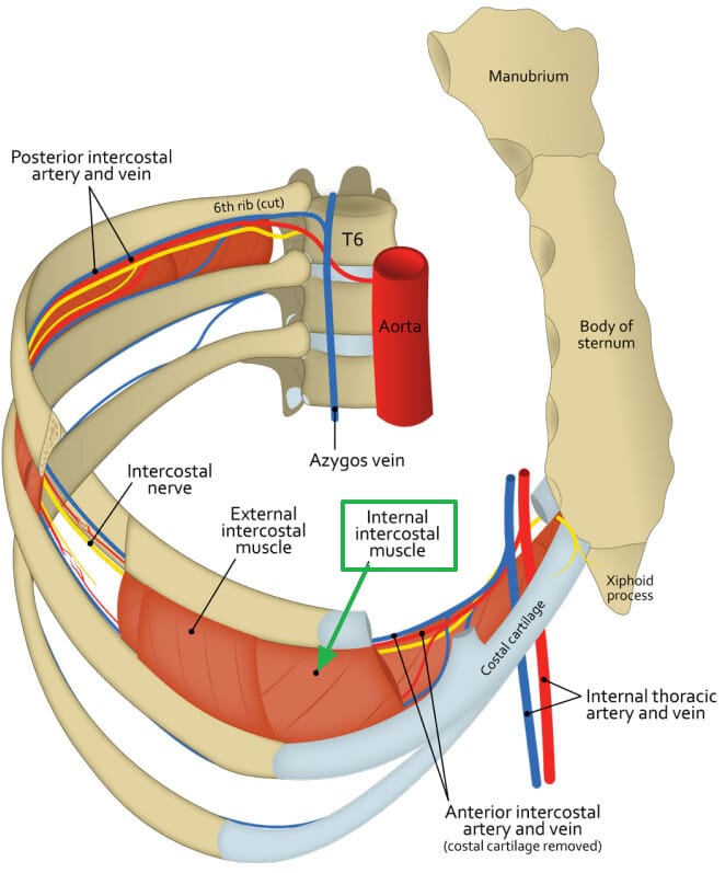 | ✅ 외늑간근 아래쪽에 위치하며, 섬유 방향은 외늑간근과 교차되어 위앞쪽을 향합니다. 강제 호기 시 갈비뼈를 아래로 당기는 역할을 합니다. |
