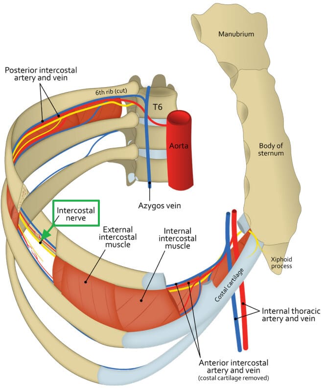 | 🔴 늑간신경통이나 대상포진이 발생하면 한쪽 늑간을 따라 심한 통증이 생기며, 신경차단술이 시행되기도 합니다. |