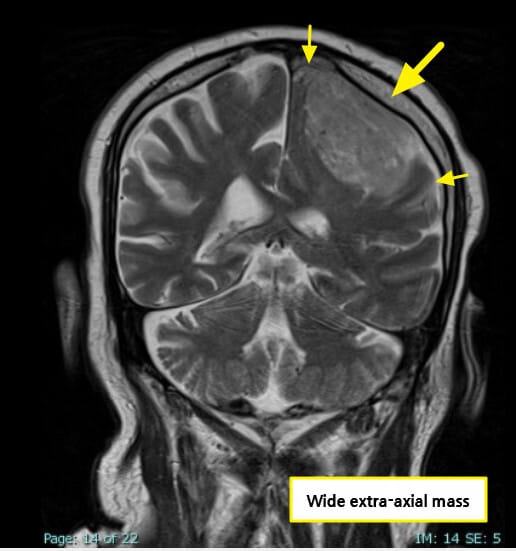 조영 증강 MRI에서 경막에 붙어 자라는 균일한 종괴가 보입니다.