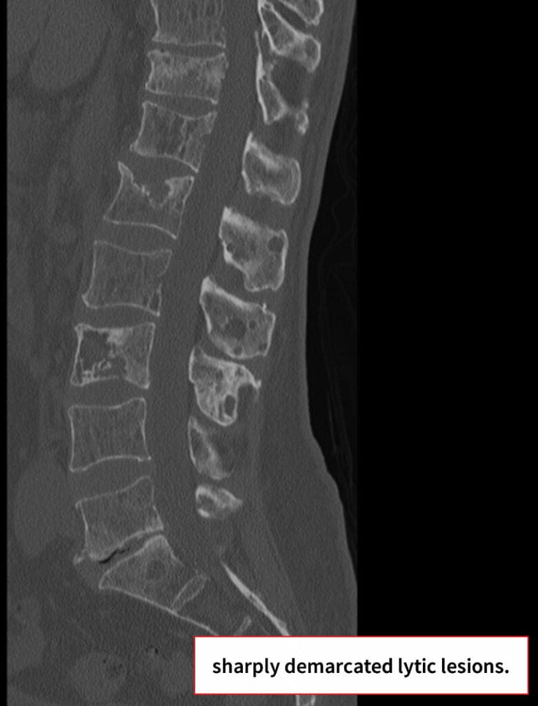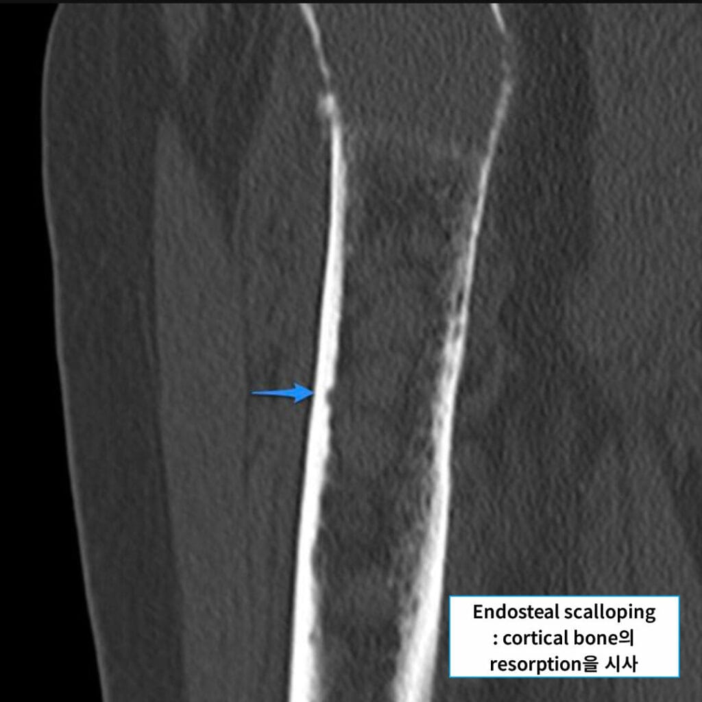Ranchod A, Multiple myeloma. Case study, Radiopaedia.org (Accessed on 22 Jul 2025) https://doi.org/10.53347/rID-170092 Gaillard F, Multiple myeloma – skeletal survey . Case study, Radiopaedia.org (Accessed on 22 Jul 2025) https://doi.org/10.53347/rID-7682 Dixon A, Endosteal scalloping in myeloma. Case study, Radiopaedia.org (Accessed on 22 Jul 2025) https://doi.org/10.53347/rID-9472 CT 소견 🟦 골소실 및 골파괴 병변 X-ray에서 보이지 않던 작은 병변도 확인할 수 있으며, cortical disruption이나 골절을 평가하는 데 유용합니다. 🟦 Soft tissue mass 동반 가능 종양세포의 연부조직 침윤으로 종괴가 형성될 수 있습니다.