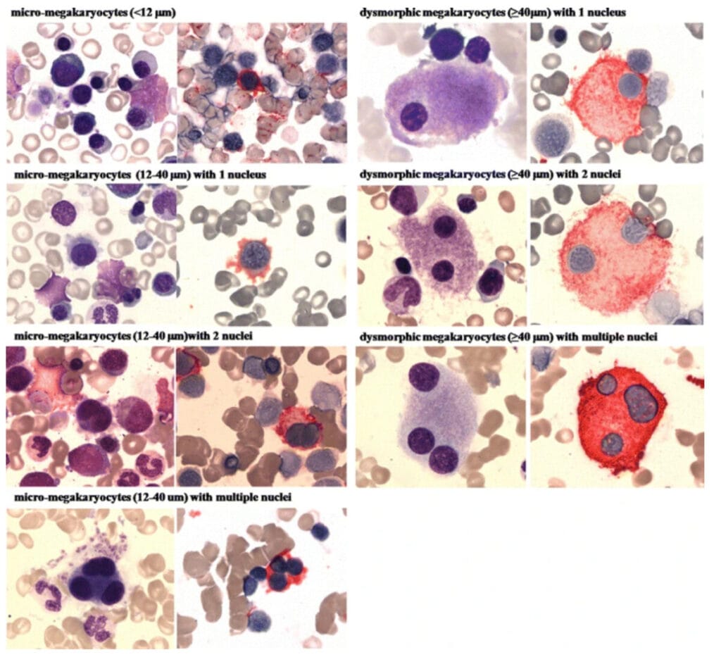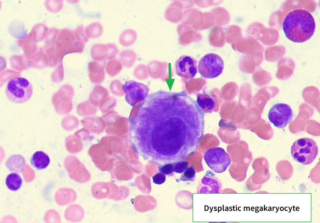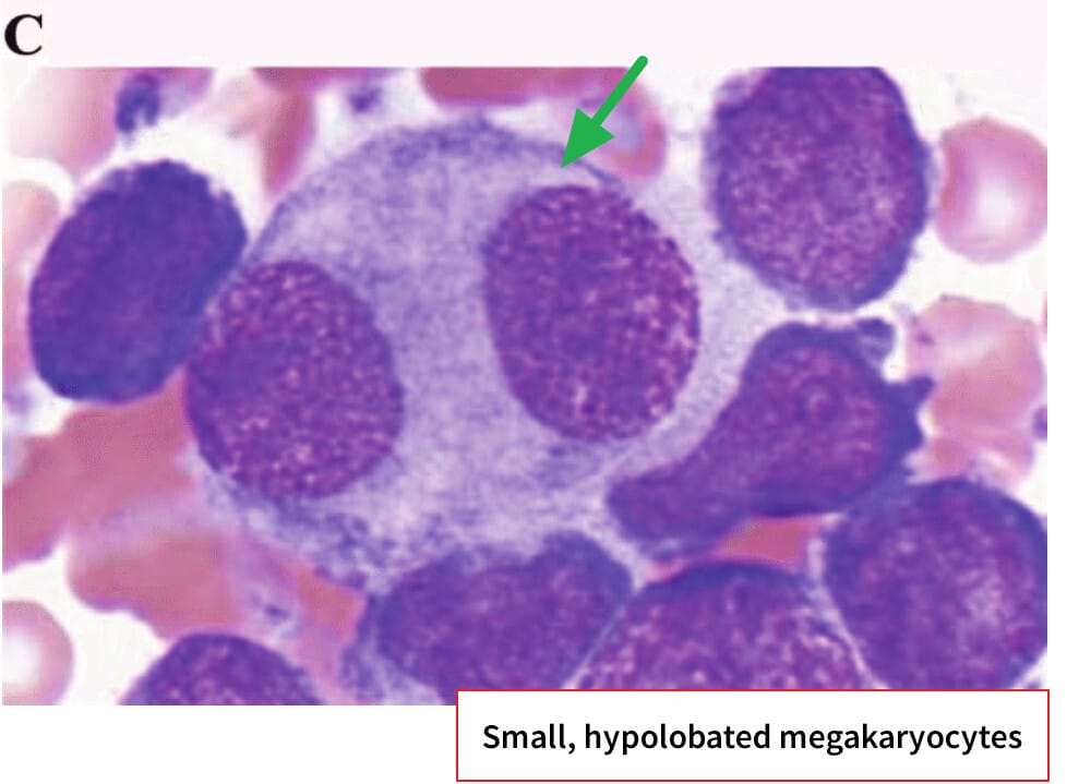 | 거대핵세포의 다분열성 및 소형화(micromegakaryocytes), 이핵성 또는 핵 소절화(dispersed nuclear lobation)가 관찰됩니다. |