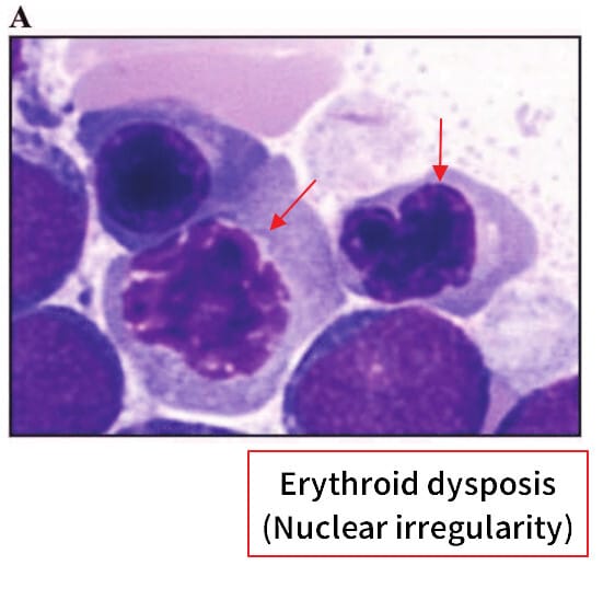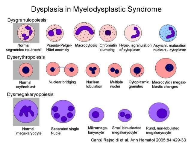 | 적혈구, 과립구, 거대핵세포 계열에서 모두 이형성(dysplasia)을 보일 수 있으며, 진단 시 10% 이상의 세포에서 이형성이 관찰되어야 합니다. |