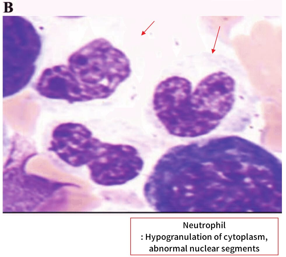 | 저세분화된 과립구(hypogranulation), 핵의 이분화, pseudo-Pelger-Huët anomaly(핵이 둘로 나뉜 중성구) 등이 나타납니다. |