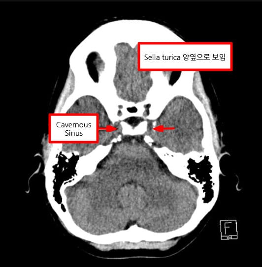 - Axial view에서 뇌하수체(sella turcica) 양 옆으로 대칭적으로 보입니다