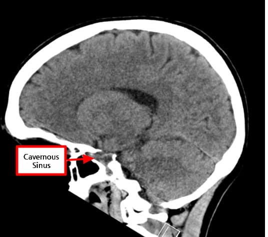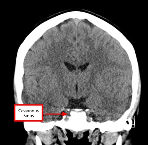 Cavernous sinus는 접형골(sphenoid bone) 옆쪽에 위치한 정맥혈이 흐르는 공간으로, Dura mater 사이에 존재하는 큰 정맥굴입니다.