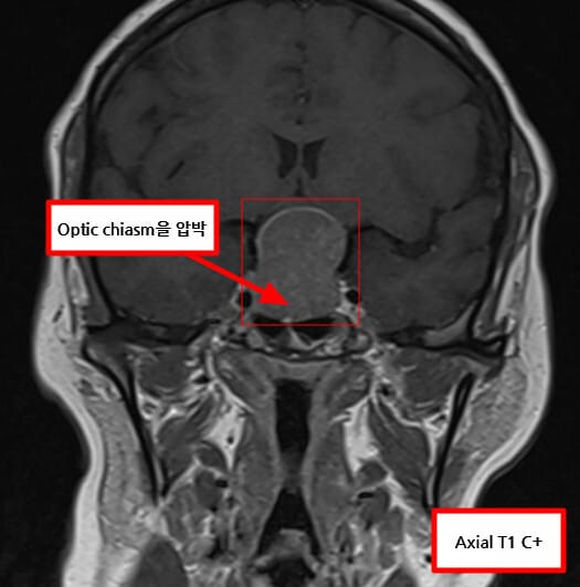 | 상방으로 확장된 종양이 시신경을 눌러 시야장애를 유발합니다. |