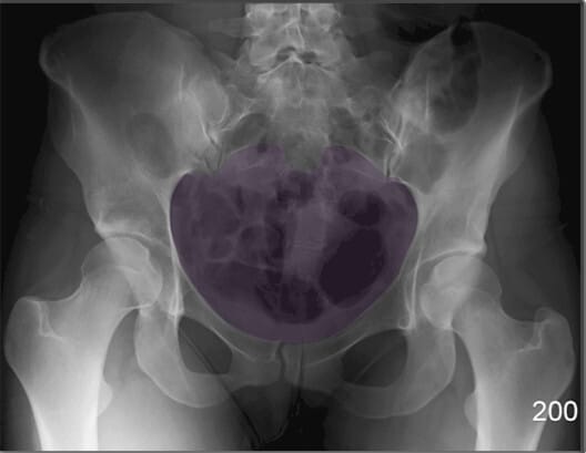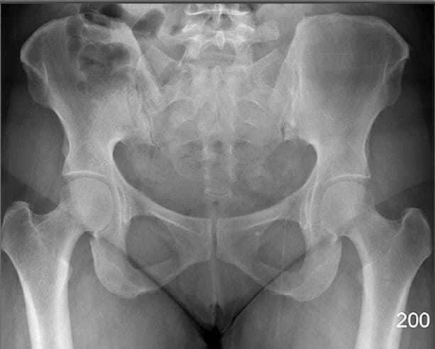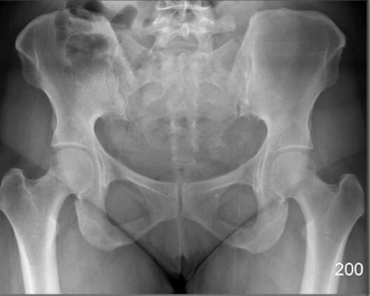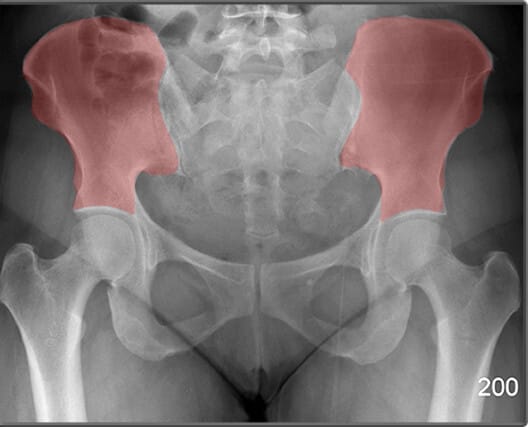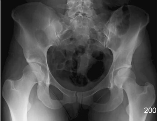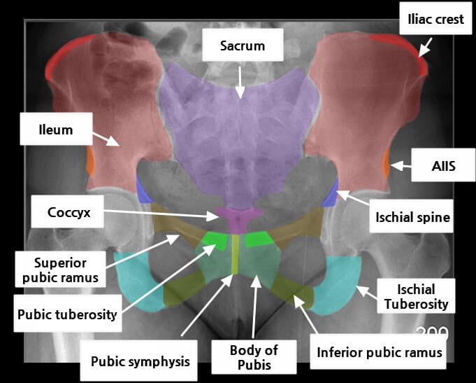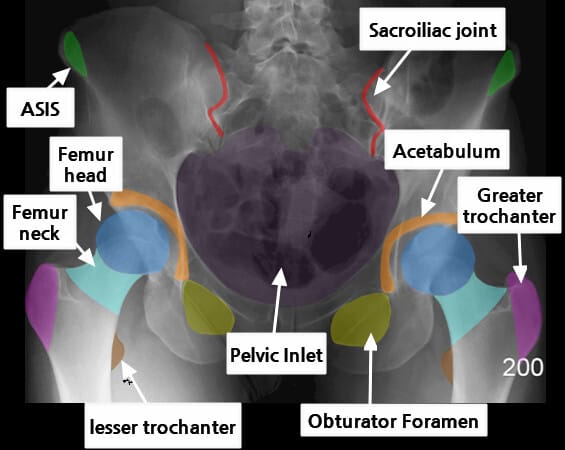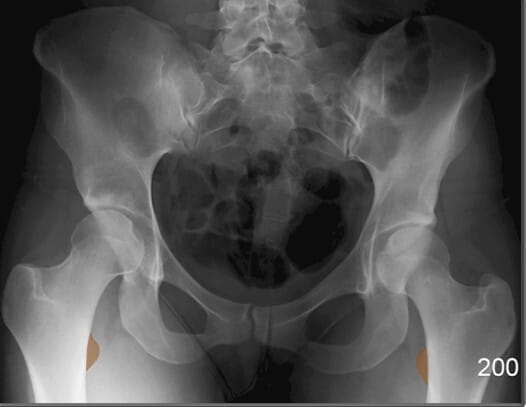 | 🔴 AP view에서는 넓은 곡선형 음영으로 관찰되며, 골반 골절 여부 평가에 중요합니다. |