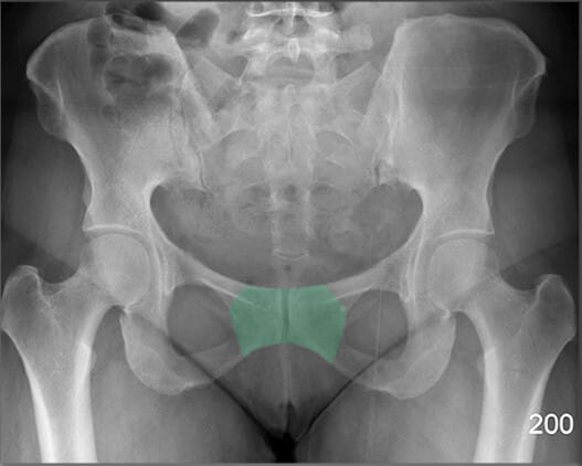 | ✅ 치골의 정중앙에서 좌우를 연결하는 섬유연골 관절로, AP view에서 골반 중앙 하단에서 좁은 간격의 음영으로 보입니다. |