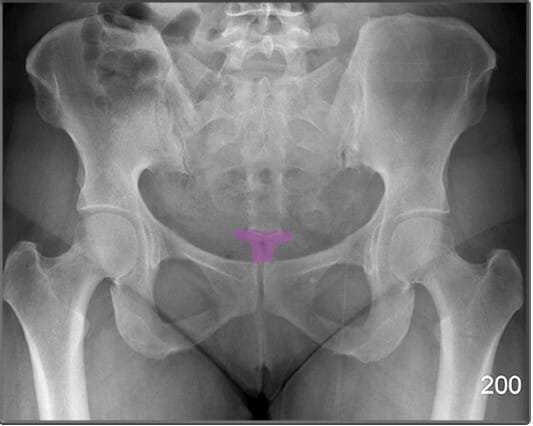 | 🔴 AP view에서는 짧고 좁은 골 구조로 보이며, 미골 통증(coccydynia)이나 외상 평가 시 주요하게 봐야 합니다. |