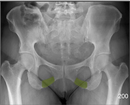 | ✅ ‘앉는 뼈’라고도 불리는 부위로, 체중이 걸리는 지점입니다. AP pelvis 영상에서 골반의 가장 하단에 큰 음영으로 보입니다. |