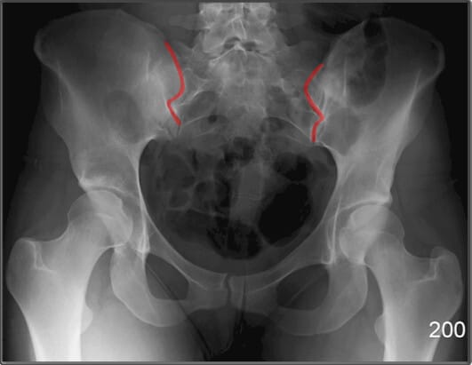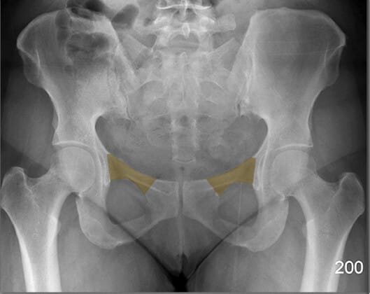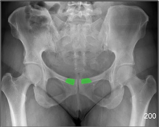 | ✅ 천골과 장골 사이의 관절로, AP view상에서 좌우 대칭적으로 좁고 긴 틈으로 관찰됩니다. |
