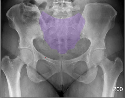 | ✅ 요추 아래에 위치하며, 미골과 연결되는 큰 삼각형 구조입니다. AP view에서 정중앙 하부에 넓은 골 구조로 관찰됩니다. |