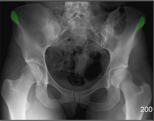 | ✅ 장골의 전면 하부에서 돌출된 골격 구조로, AP pelvis 영상에서 양측 장골의 앞쪽 경계선 부근에 위치합니다. |