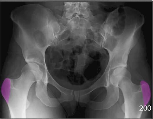 | 🔴 노인의 고관절 골절이 자주 발생하는 부위로, 윤곽 변화나 불연속성을 신경 써서 관찰해야 합니다. |