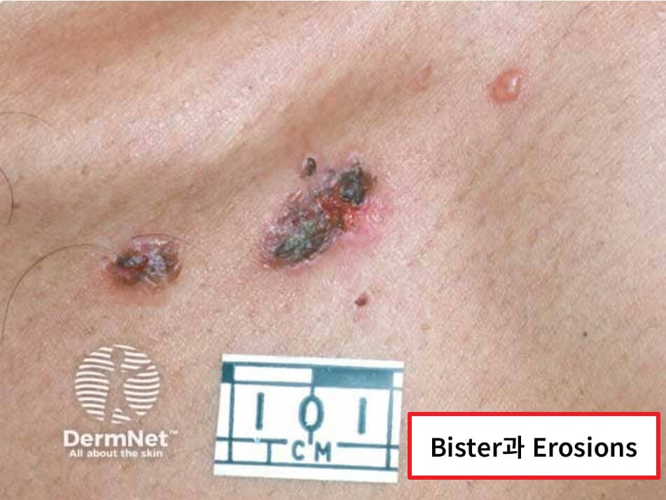 수포가 터진 자리에 통증성 미란이 남으며, 세균 감염 위험이 높습니다.