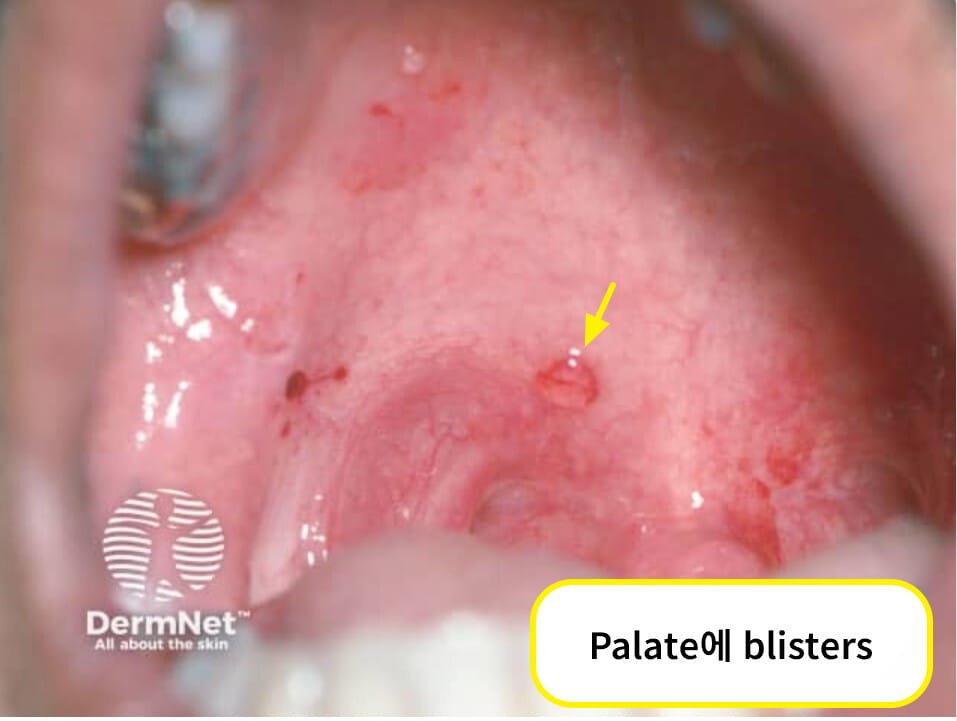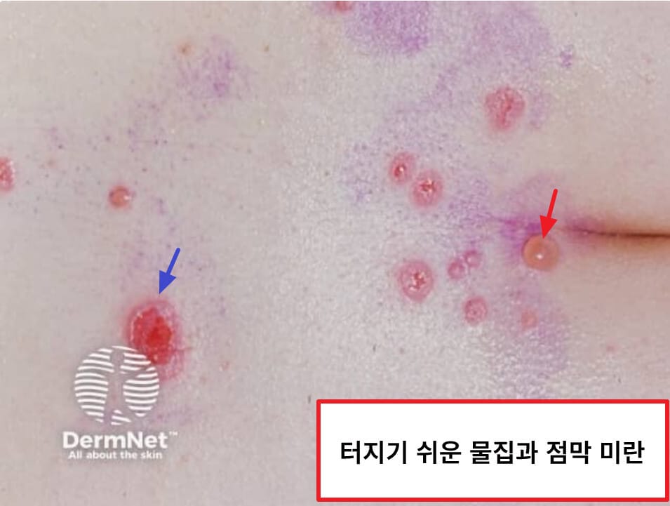 점막 침범이 흔하게 발생하, 물집은 얇고 쉽게 터집니다.