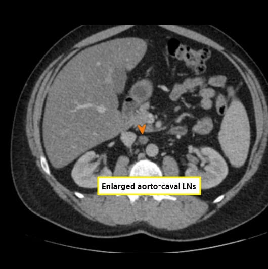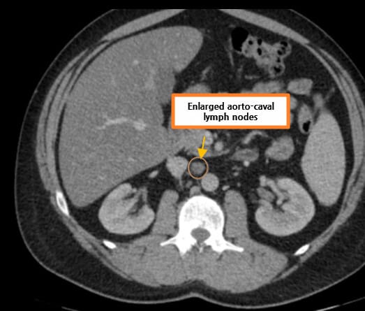 | 종양이 인접 장기(부신, 대장 등)를 침범하거나, 원격 전이(폐, 뼈, 간 등)가 있는 경우. |