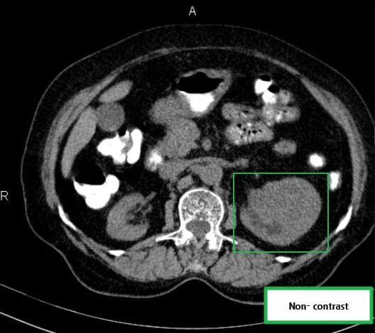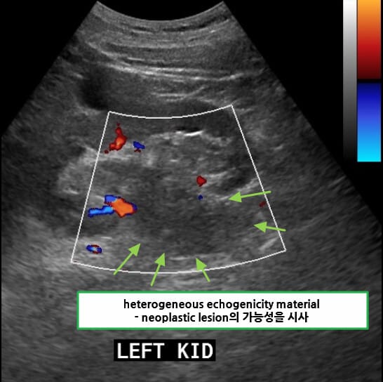 | 신장 종괴 확인 가능하나, 고형성 여부나 혈관 침범은 판단이 어려워 선별 검사로 사용됩니다. |