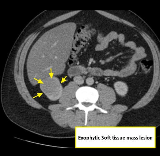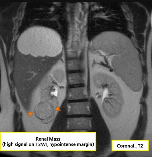 | 종양이 신장 피막을 넘어서 돌출되거나, 신장의 외형이 비정상적으로 변형된 경우 진행된 병기 가능성을 고려합니다. |