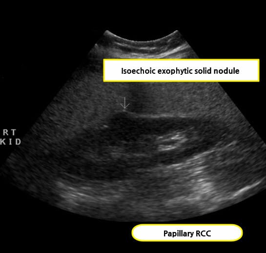| 주로 신장 실질 내에 존재하는 경계 명확한 고형 병변으로 보이며, 주변 실질에 비해 에코가 높거나 비슷한 양상을 보입니다. |
