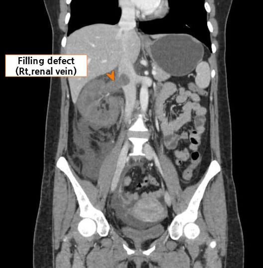 | Renal vein의 혈류를 막는 filling defect가 관찰될 수 있습니다. |