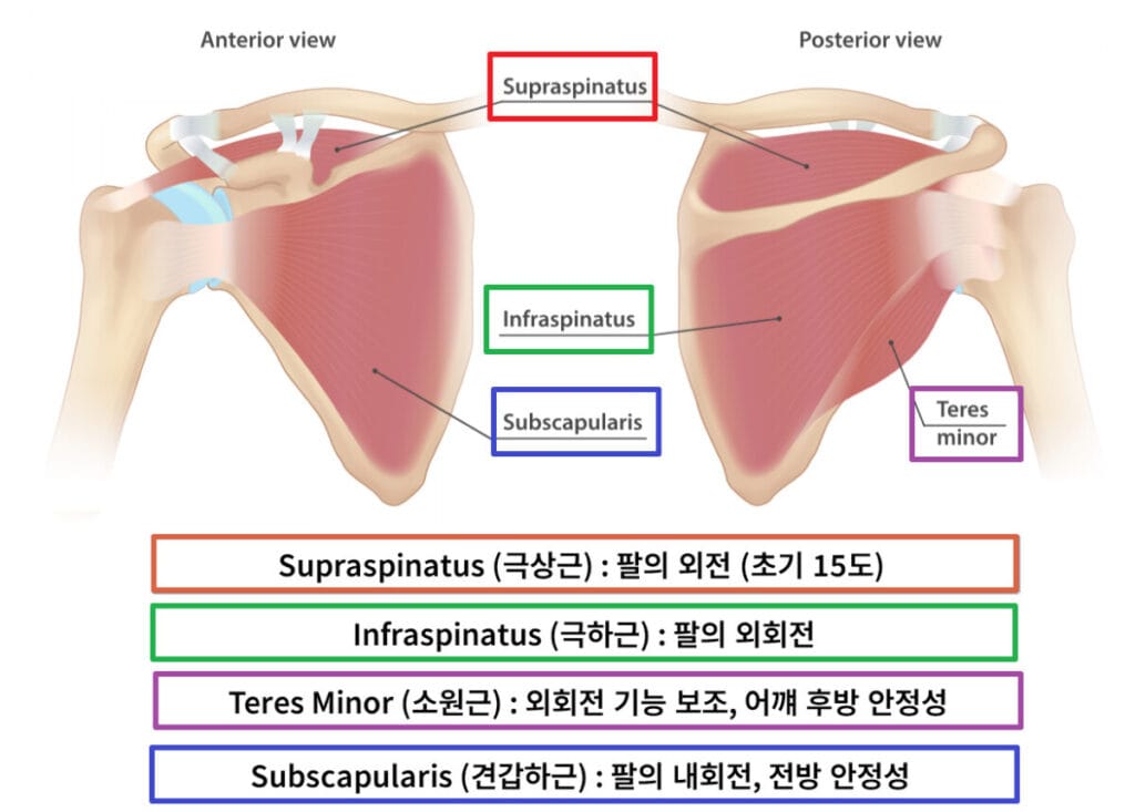 Rotator Cuff는 어깨 관절을 안정화하고 팔의 회전 및 움직임을 조절하는 네 개의 근육으로 구성됩니다.