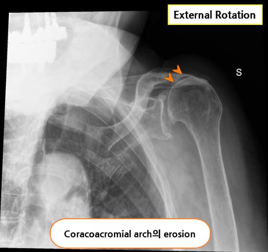 | 특히 외전(abduction) 및 외회전(external rotation) 시 근력 저하가 관찰됩니다. |