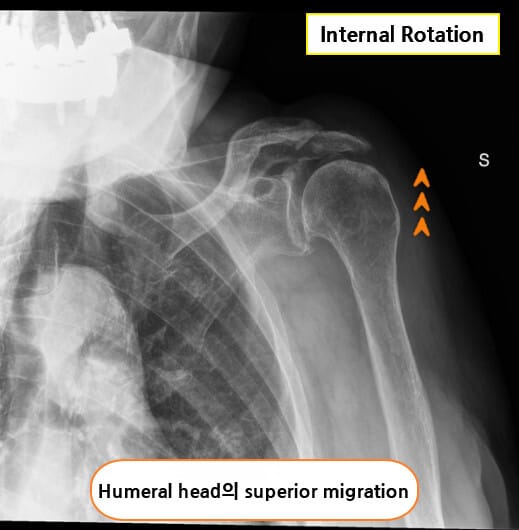 회전근개 자체는 관찰되지 않지만, 상완골의 상방 전위(superior migration of humeral head), 견봉하 공간 협소(subacromial space narrowing), 석회화(calcium deposit) 등이 간접적으로 파열을 시사할 수 있습니다.
