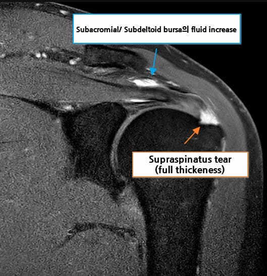 회전근개 힘줄의 부분 또는 완전 파열 여부, 파열 크기, 주변 근육의 지방 변성 및 위축 소견을 확인할 수 있습니다. 액체 음영이 파열 부위에 고여 있는 소견(fluid-filled gap)이 특징적입니다.